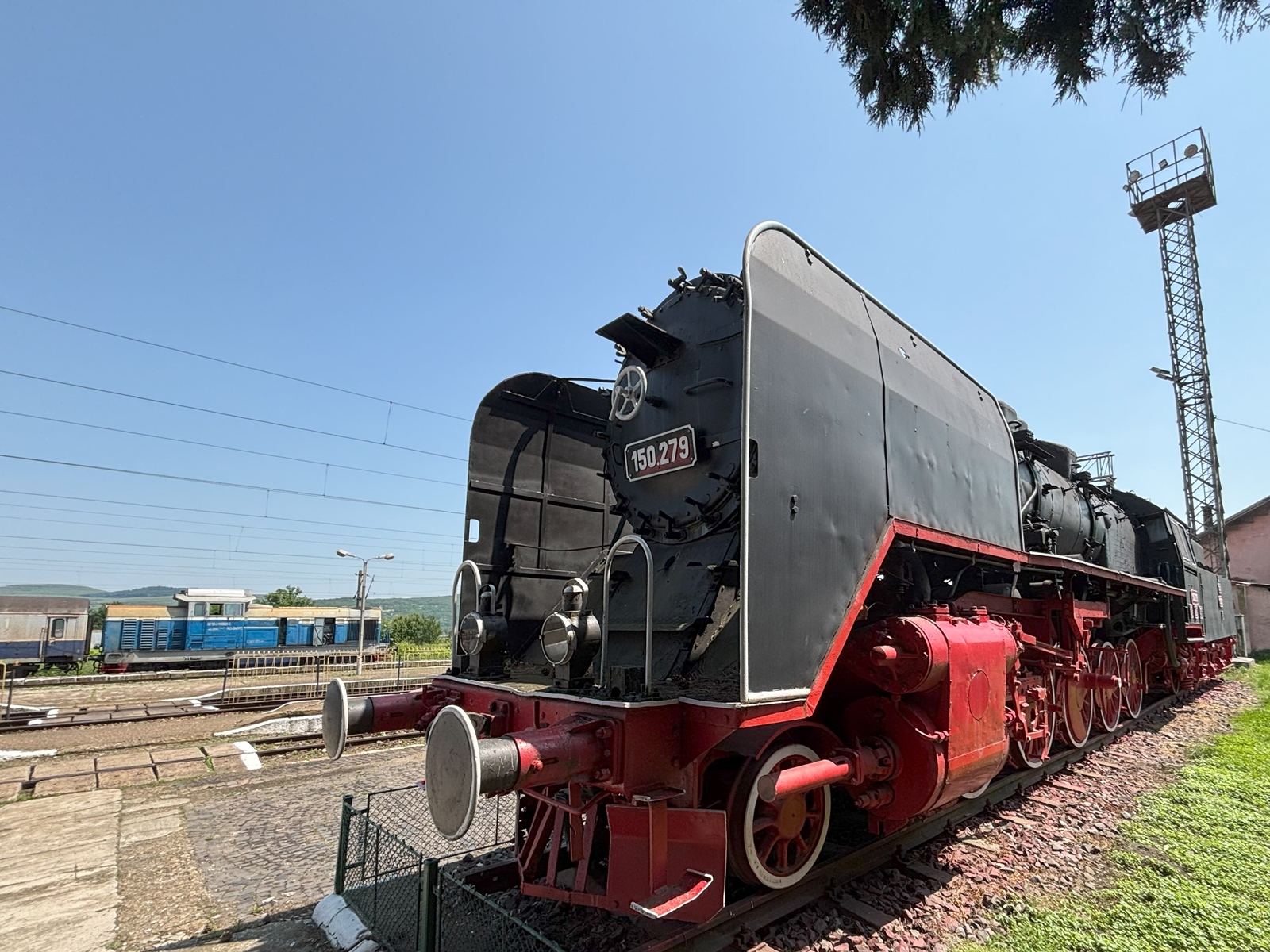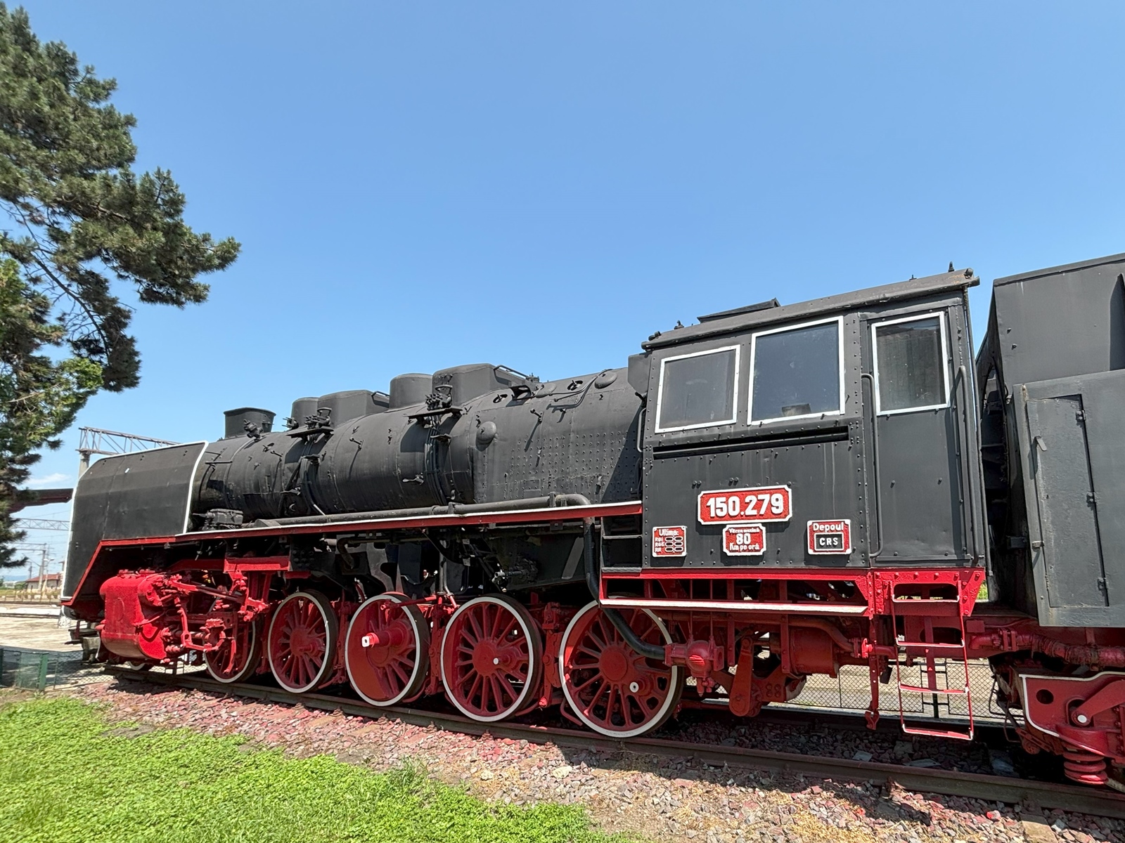 Gara este flancată în dreapta de locomotiva cu abur 150.279, pentru cale ferată normală și cu tender separat. A fost ultimul tip de locomotivă cu abur realizat în România, fiind utilizat de CFR pentru remorcarea trenurilor grele de marfă. Locomotiva 150.279 a fost construită în 1960 în Reșița (nr. 3395 / 1960) și a făcut serviciul în cadrul depourilor Caransebeș, Timișoara și Lugoj, unde a parcurs 660461 km până în data de 1 Martie 1976, când a fost retrasă din serviciu. Această locomotivă, ce avea o greutate de 86,9 tone și atingea o viteză de 80 km/oră, este clasată drept „tezaur de patrimoniu”.