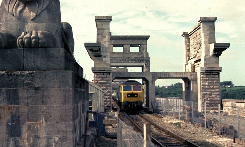 Monumentul impunător, ce se întinde dincolo de strâmtoarea Menai, a fost realizat în 1846–1850 de Robert Stephenson și Francis Thompson (LNWR). Piloni de zidărie cu profiluri vag egiptene înclinate, cornișe în cavetto și antablamente grele; flancați de lei sculptați (de John Thomas) la capete. Designul tubular original a fost înlocuit în reconstrucția din 1980.